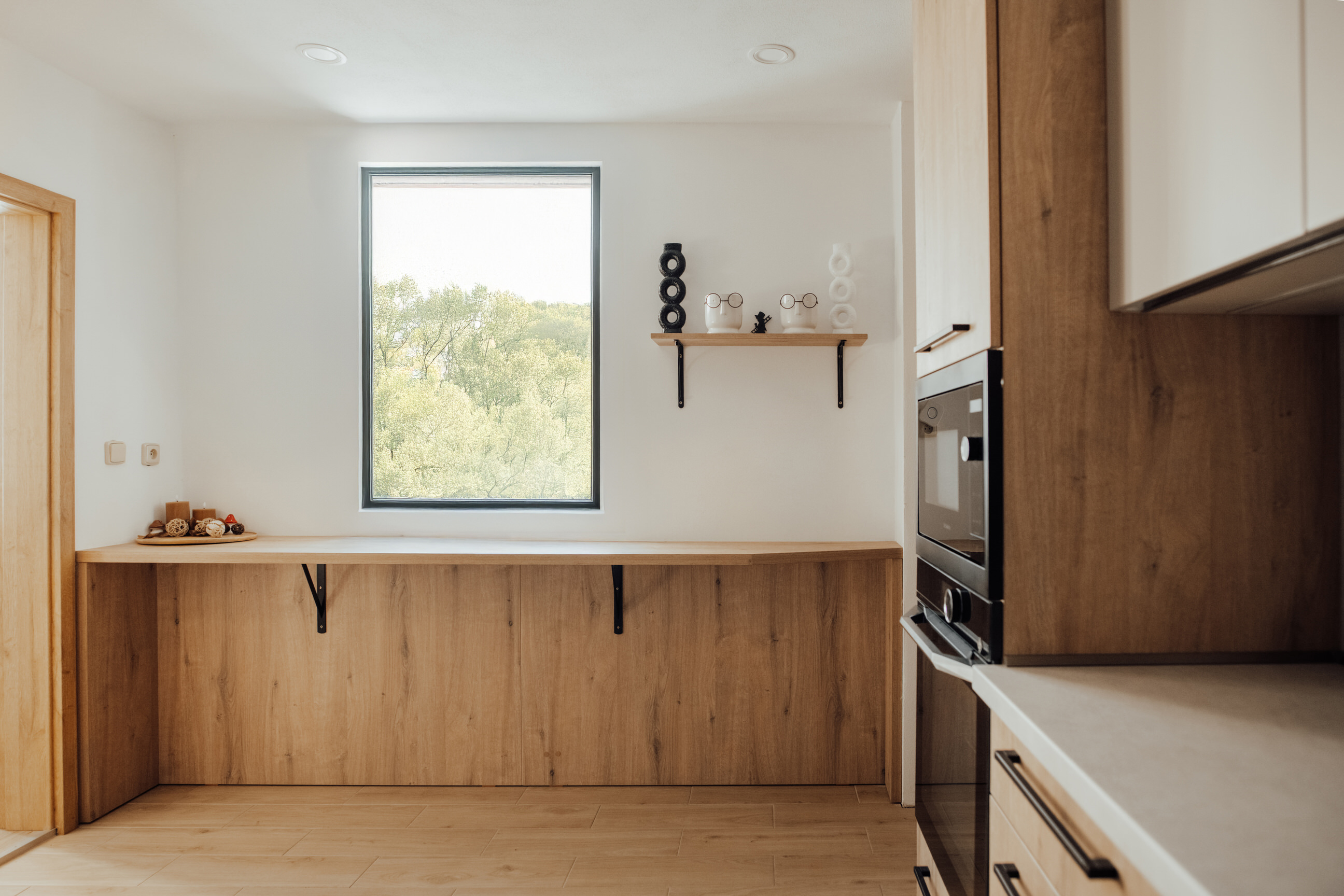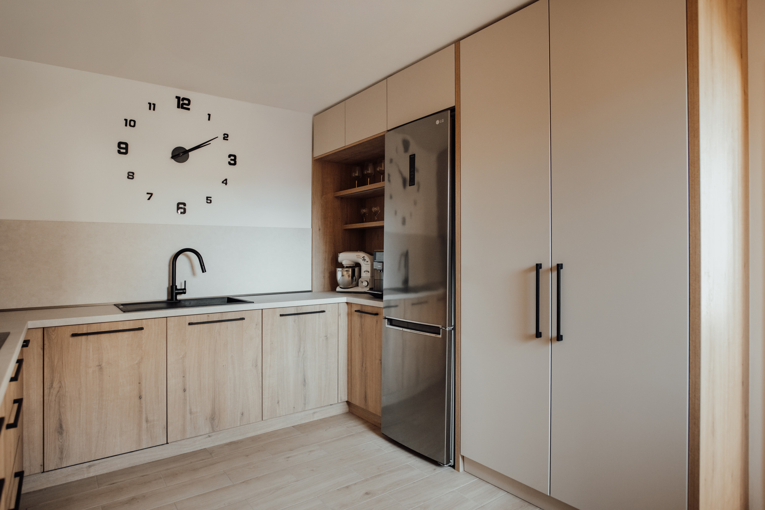kuchyň - dvířka bílá mat, s kombinací dub divoký