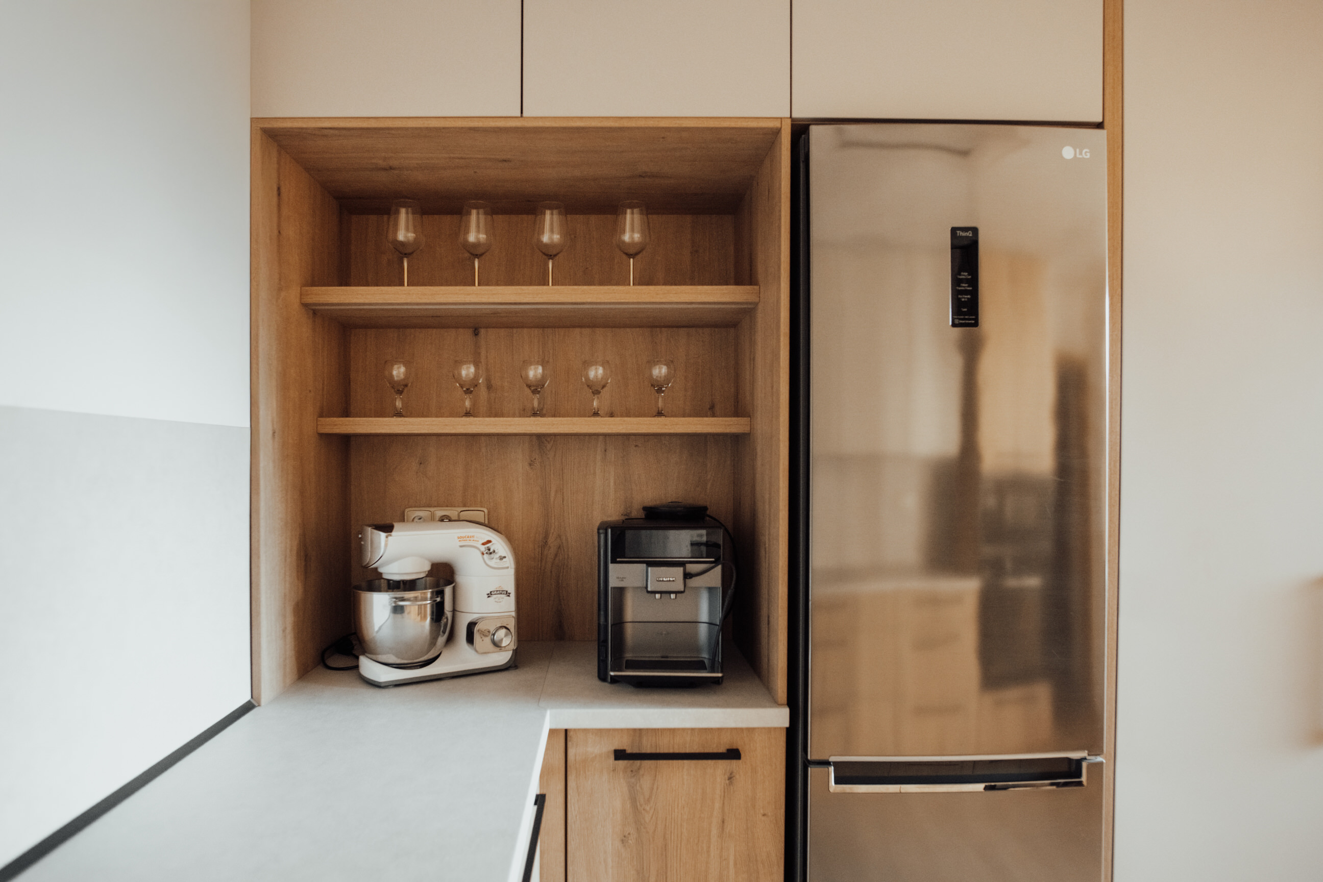 kuchyň - dvířka kaschmir s kombinací s dřevodekórem