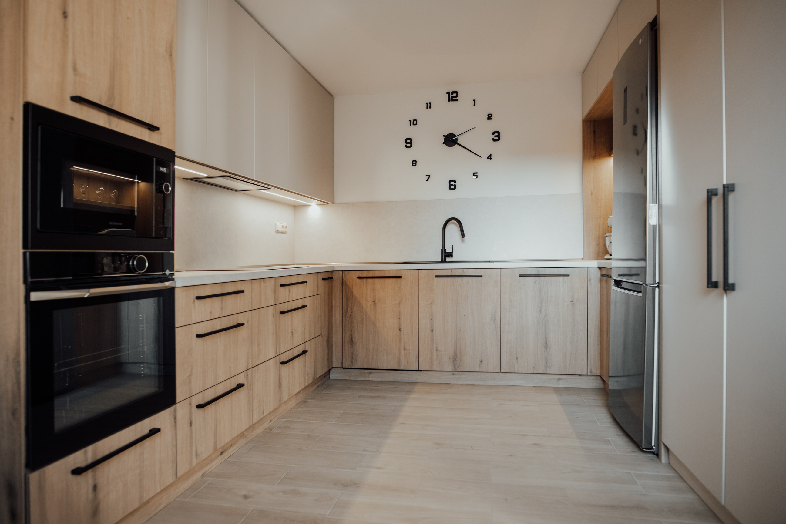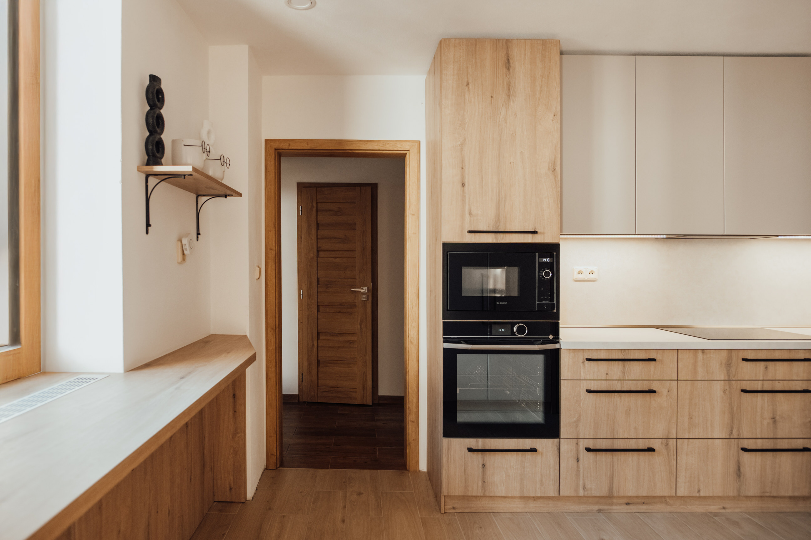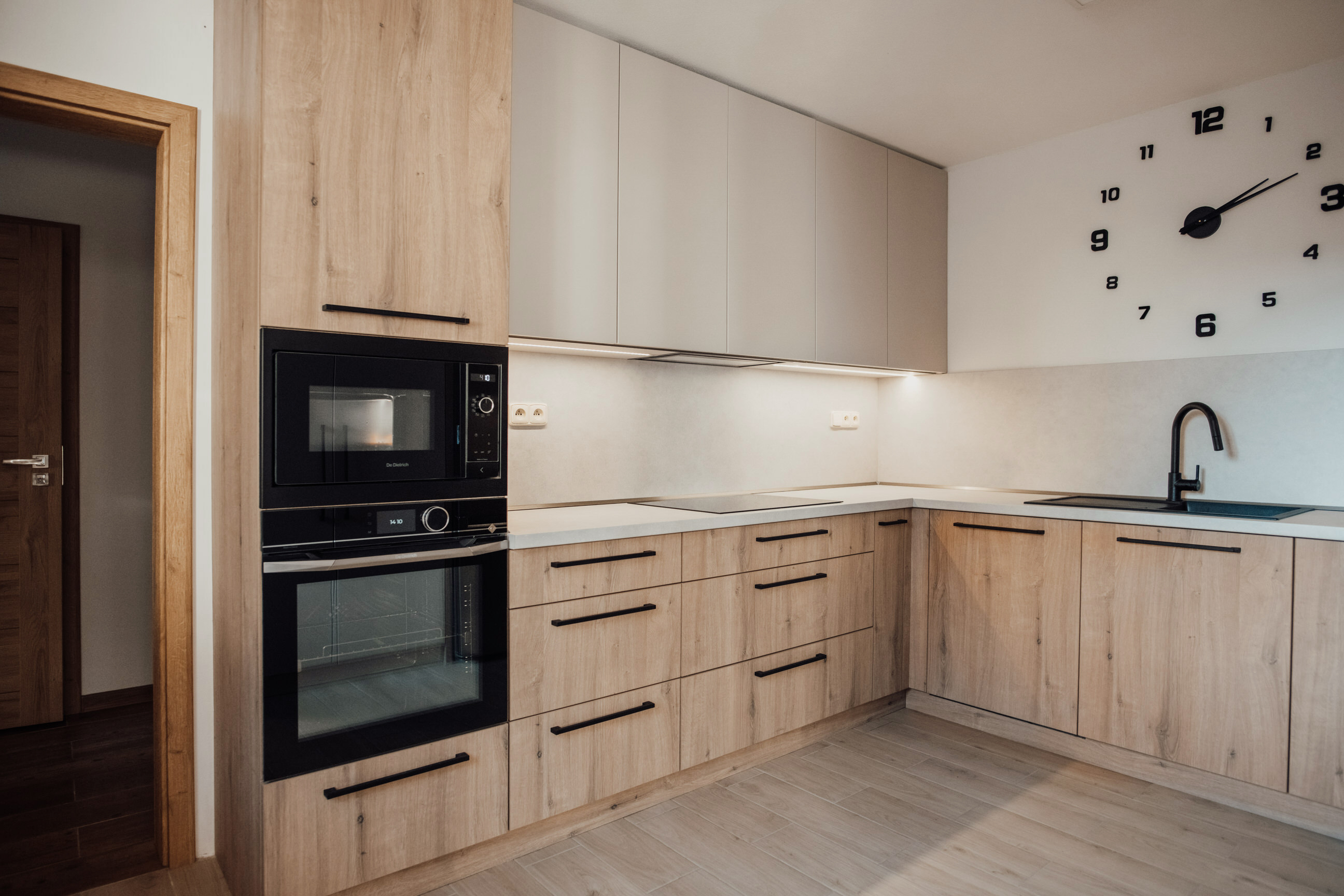 kuchyň - dvířka černá supermat, dub trend a masiv s kombinaci světlé pracovní desky
