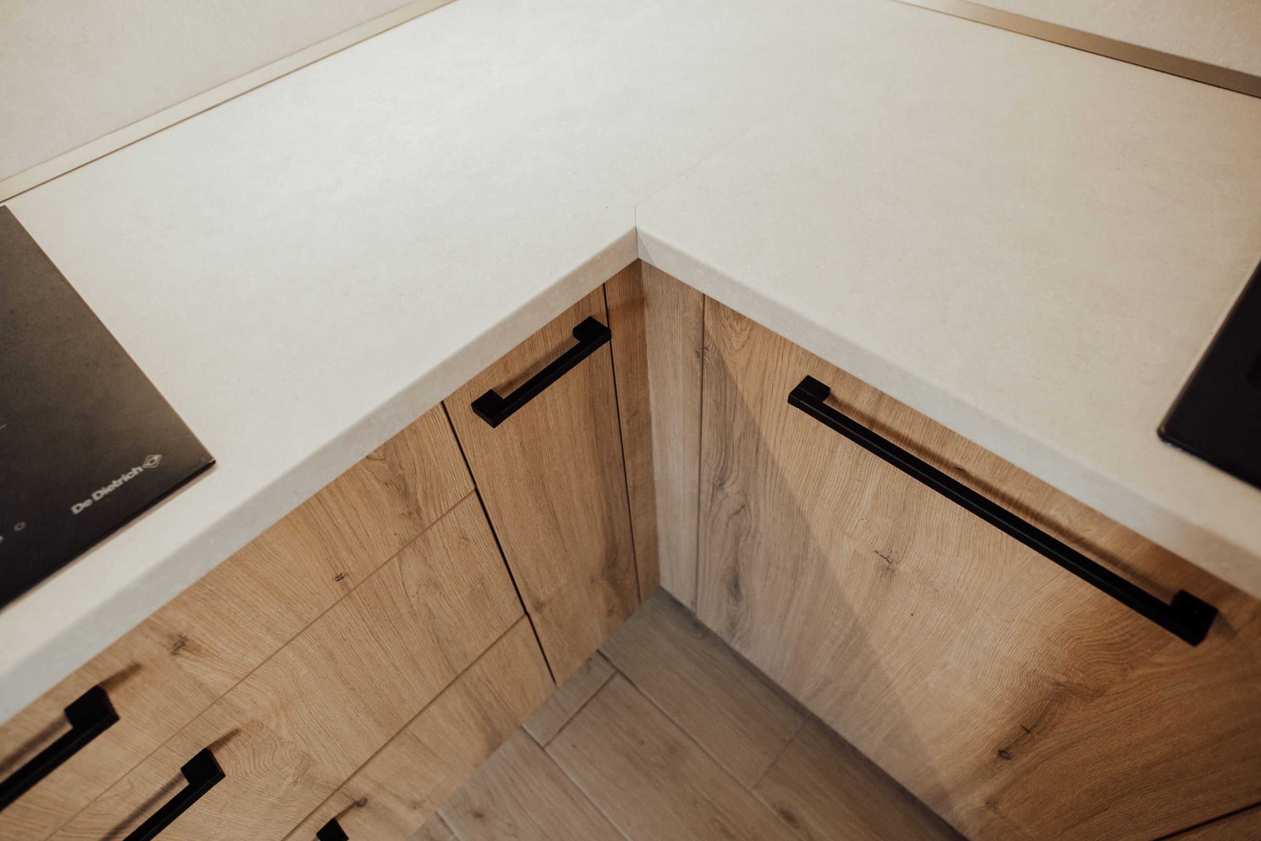 kuchyň - dvířka kaschmir s kombinací s dubovou koňakovou deskou